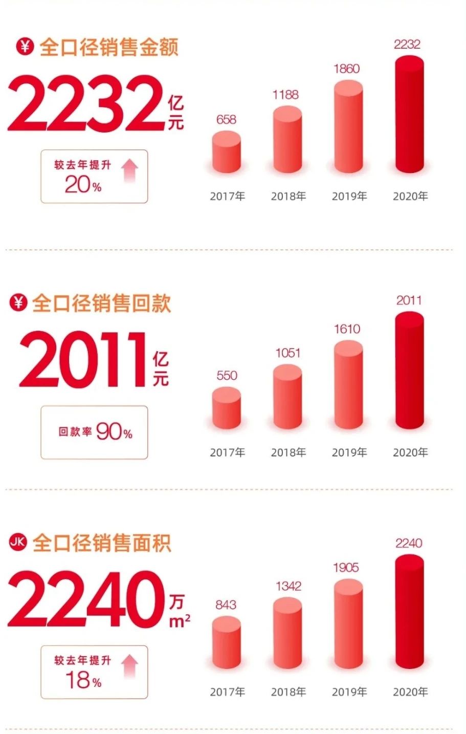 2020年,金科銷售金額突破2200億元,書寫了從2017年至2020年年復(fù)合增長(zhǎng)率超50%的記錄;銷售面積超過2200萬(wàn)平方米,位列行業(yè)前十;服務(wù)面積超3億平方米,位列全國(guó)前十。公司經(jīng)營(yíng)質(zhì)效持續(xù)改善,行業(yè)地位不斷攀升。