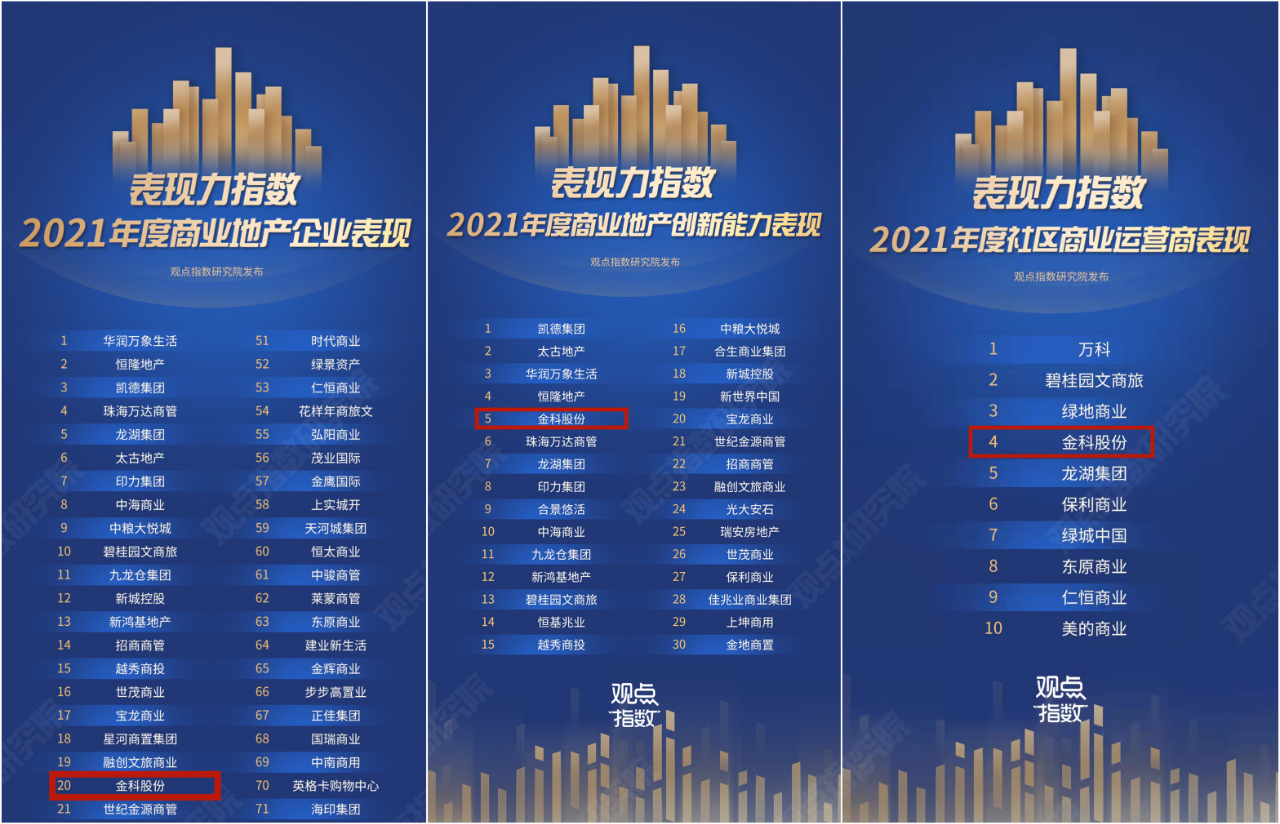 基于在商業(yè)創(chuàng)新和社區(qū)運營的優(yōu)秀表現(xiàn),金科同步榮列2021年度商業(yè)地產(chǎn)創(chuàng)新能力TOP5,金科商業(yè)榮列2021年度社區(qū)商業(yè)運營商表現(xiàn)TOP5。