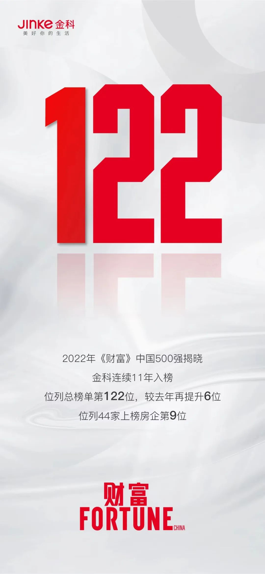7月12日,財富中文網(wǎng)發(fā)布了2022年度《財富》中國500強企業(yè)排行榜,金科股份(000656.SZ)憑借穩(wěn)健發(fā)展態(tài)勢,再次榮登《財富》中國500強企業(yè)榜單,位列總榜單第122位,較去年再提升6位,同時位居44家上榜房企第9位。這也是金科股份連續(xù)11年上榜,公司實力再獲國際權威機構高度認可。