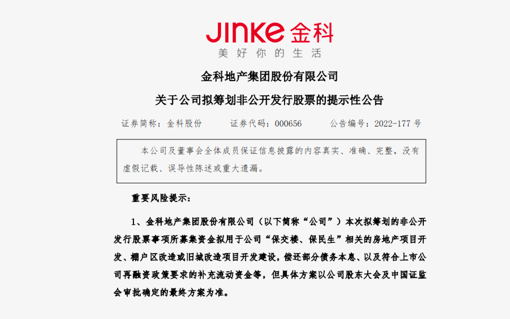 金科股份在12月5日晚間也發(fā)布公告稱,擬向不超過(guò)35名特定投資者非公開發(fā)行股票,募集資金擬用于公司“保交樓、保民生”相關(guān)的房地產(chǎn)項(xiàng)目開發(fā)、棚戶區(qū)改造或舊城改造項(xiàng)目開發(fā)建設(shè),償還部分債務(wù)本息、以及符合上市公司再融資政策要求的補(bǔ)充流動(dòng)資金等。