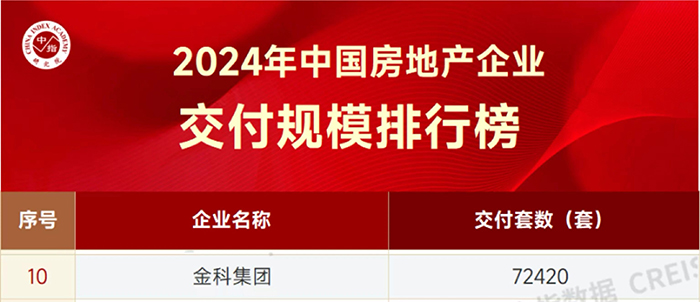1月14日,中指研究院發(fā)布“2024年中國房地產(chǎn)企業(yè)交付規(guī)模排行榜”,金科以全年累計交付總套數(shù)72420套的亮眼成績,位列榜單第十位,持續(xù)領(lǐng)先行業(yè)平均水平。